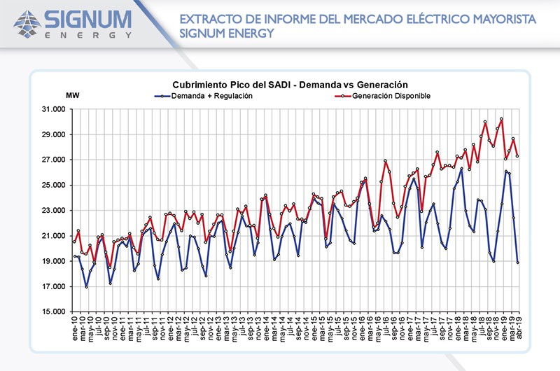 Resulta importante destacar que, se evidencia una mayor capacidad de Reserva de Generación Disponible en los momentos de producirse el requerimiento máximo de potencia mensual, promediando el 20,5% de Reserva respecto a la Demanda Máxima de Potencia en cada mes durante el año 2019.