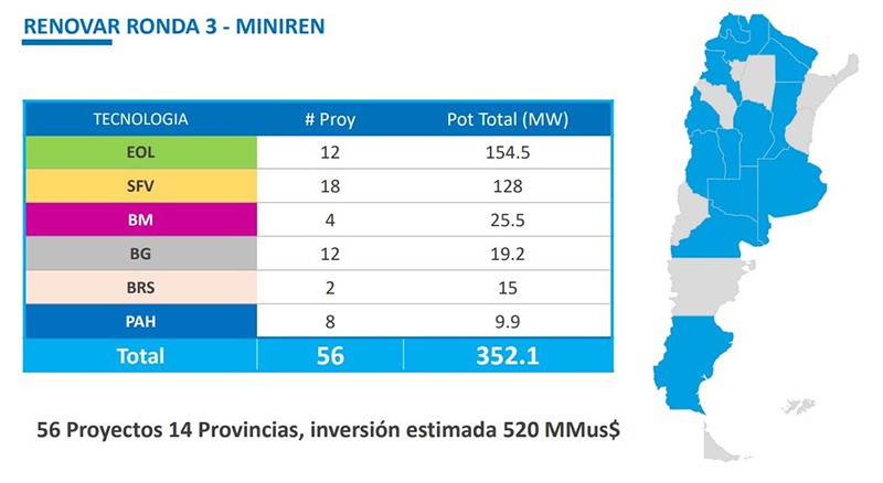 Hace minutos finalizó la apertura de sobre A de la licitación Mini Ren Ronda 3 del Programa RenovAr. Los proyectos, distribuidos en 14 provincias del país, suman una potencia de 352 MW, por una inversión estimada de 520 millones de dólares.