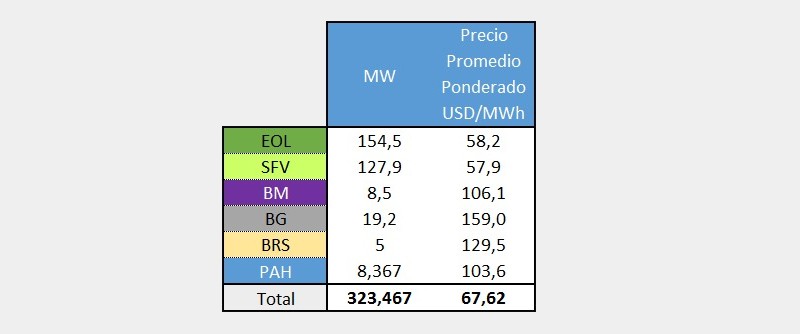 De los 52 proyectos que aprobaron la instancia técnica, el precio más competitivo resultó del rubro eólico, a 52,5 dólares por MWh. Luego le siguió el segmento solar fotovoltaico. Los más caros fueron los de biogás, donde casi todos ofertaron 160 dólares por MWh.